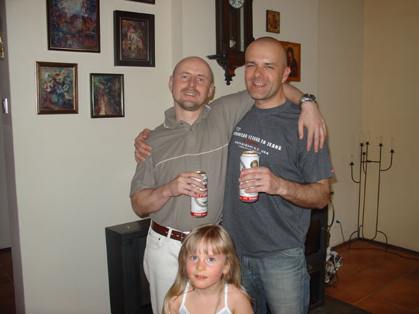 W mieszkaniu Arka i Doroty (jego żony) znalazło się przypadkiem dwóch rozśpiewanych hydraulików. Pan Gienek (z lewej) i pan Ździsiek (z prawej). Ździsiek mówi do Gienka: "Ty, popa, jaka laska robi nam zdjęcie. Zaraz jom zapoznam." A to ja im zdjęcie robiłam. Robiłem. Na pierwszym planie moja córka, deprawowana.Teraz o najbardziej tajemniczym z moich przyjaciół, Jarku Bralskim. Nie łatwo zobaczyć go w miejscu publicznym, bo najlepiej się czuje w swojej jaskini albo - kontrastowo - na dalekim, samotnym szlaku. Jeśli nie jesteście wtajemniczeni, napotkacie także trudności w usłyszeniu jego głosu, bo hołduje przysłowiu, że milczenie jest złotem. Poznałem go w pierwszej klasie pułtuskiego liceum i do dzisiaj utrzymujemy kontakt: rozmawiamy o grach (głównie o Dawn of War), muzyce i życiu. Chociaż Jarek nie jest osobą ekspresyjną, jego wyczyny i umiejętności mówią głośniej od niego. Oto niedawno objechał nasz kraj na rowerze (podróż zajęła miesiąc), wcześniej przeszedł pieszo Bieszczady, przespacerował się także wzdłuż polskiego wybrzeża. Komponuje muzykę elektroniczną, razem uczyliśmy się śpiewu u basa Filharmonii Narodowej, Ryszarda Opackiego. Jarek ma w domu małe studio nagraniowe: profesjonalny mikrofon, komputer obciążony krociem kart muzycznych, kilka modułów brzmieniowych i skrzynek z efektami, syntezator i wyważoną klawiaturę. Bardzo dobrze gra w brydża. Gdy na studiach klepałem biedę, spędzałem u niego setki godzin grając w amigowe przeboje i sycąc się potrawą o nazwie "spaghetti wdowca". Niezapomniane czasy.